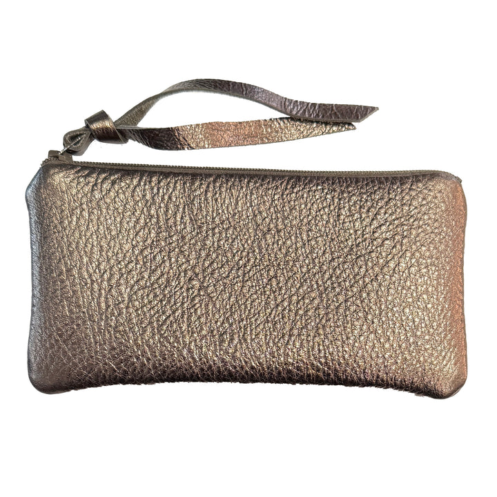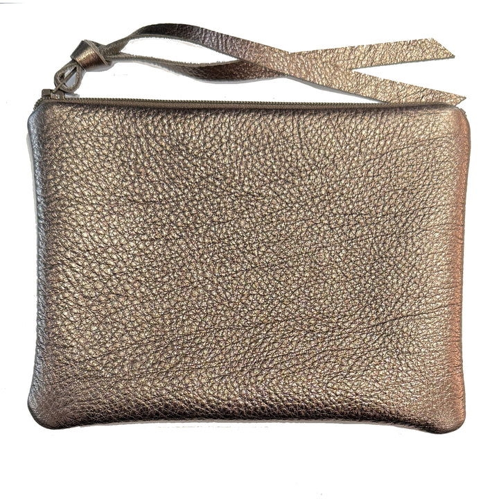 Handmade from a luxurious metallic natural leather, these zipper pouches are available in three sizes. The small is 4" x 5", the medium is 3.5" x 7" and the large is 5.5" x 7". All are lined in fantastic contrasting fabric.