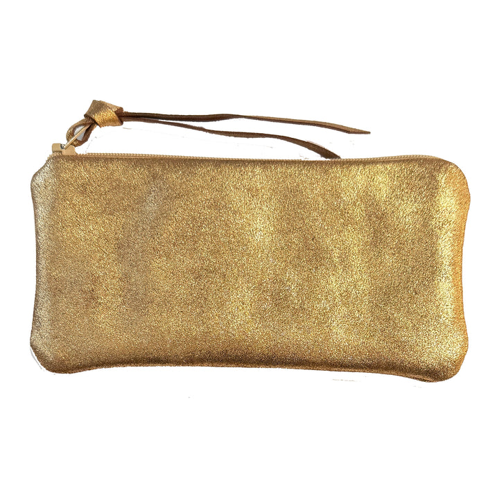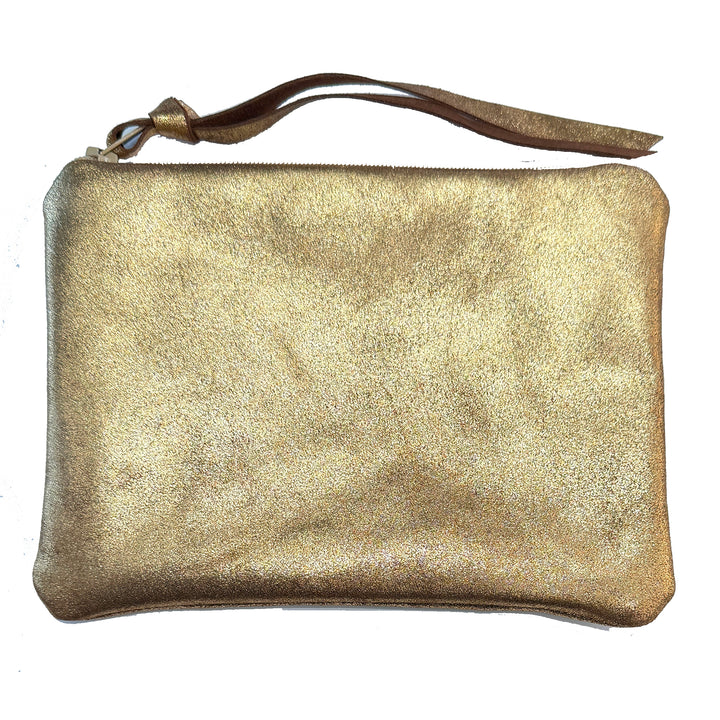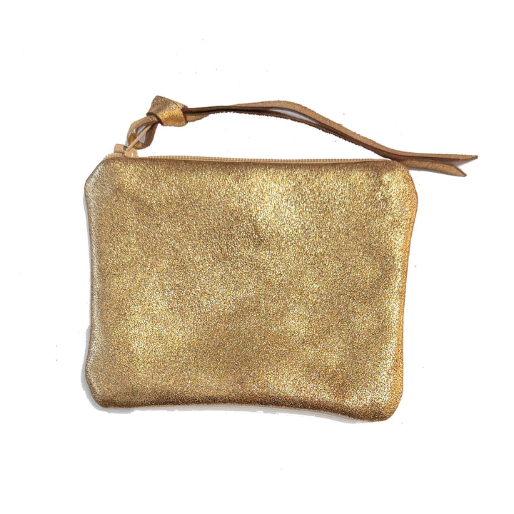 Handmade from a luxurious metallic natural leather, these zipper pouches are available in three sizes. The small is 4" x 5", the medium is 3.5" x 7" and the large is 5.5" x 7". All are lined in fantastic contrasting fabric.